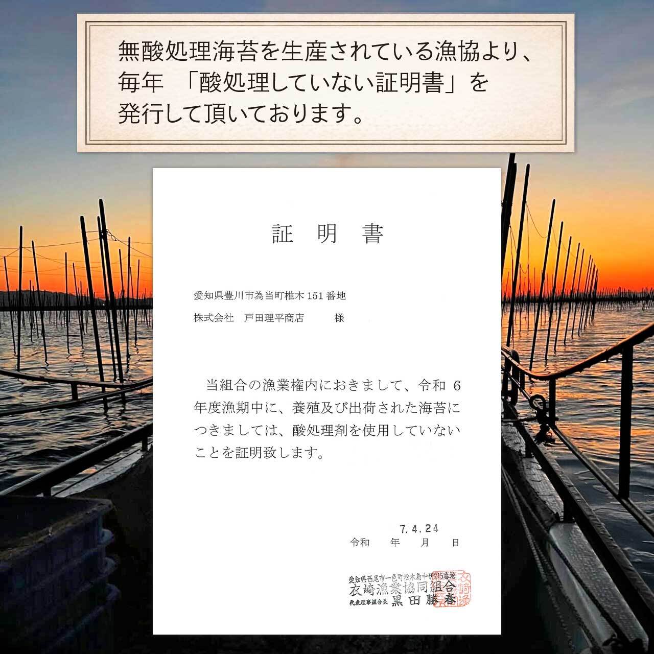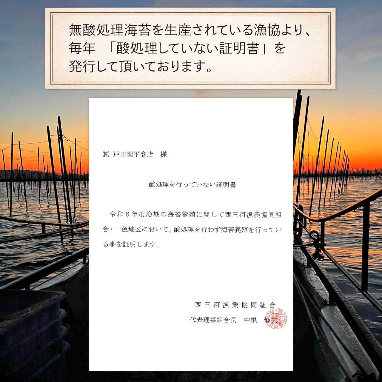 海苔の養殖では、病気予防のために「酸処理」が行われることがあります。これは養殖網を酸処理剤に浸す工程で、一般的に広く実施されている方法です。一方、西三河の海では酸処理を行わない「無酸処理」で育てられた海苔が生産されています。生産量は全国的に見てもごくわずかで、非常に希少です。