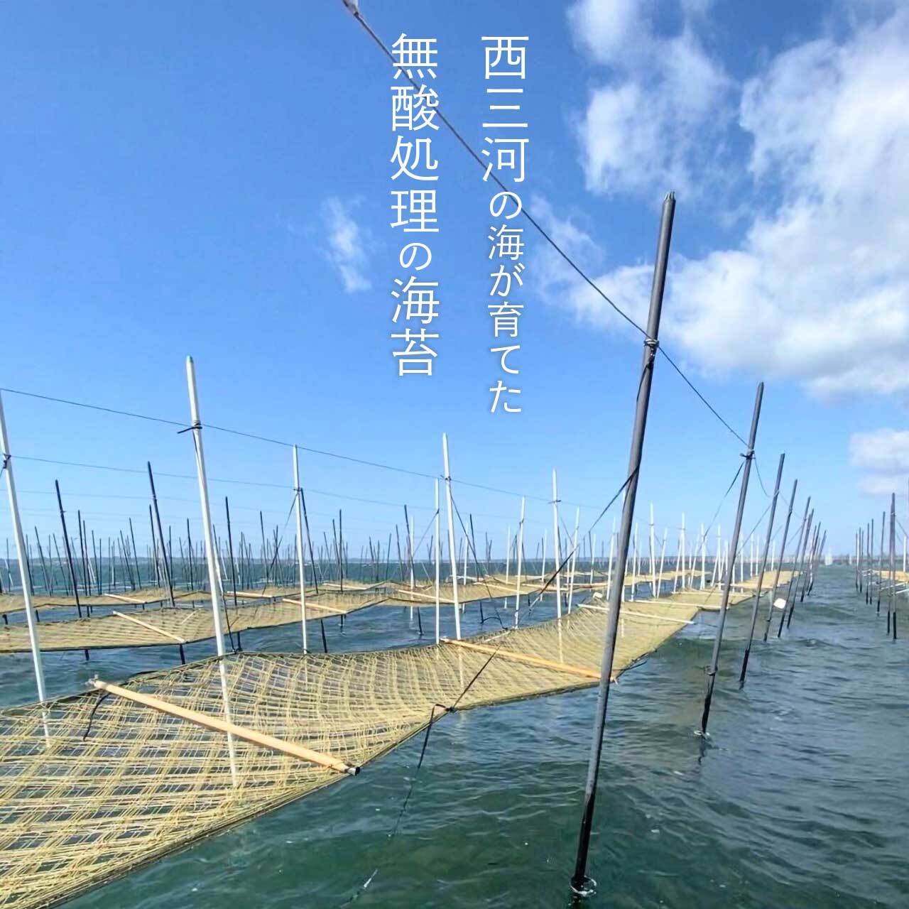 西三河産の海苔は、香り高く、口の中でじゅわっと旨みが広がり、旬のものはとろけるような口どけが特徴です。自然環境への配慮とともに育てられた、豊かな味わいをぜひお楽しみください。