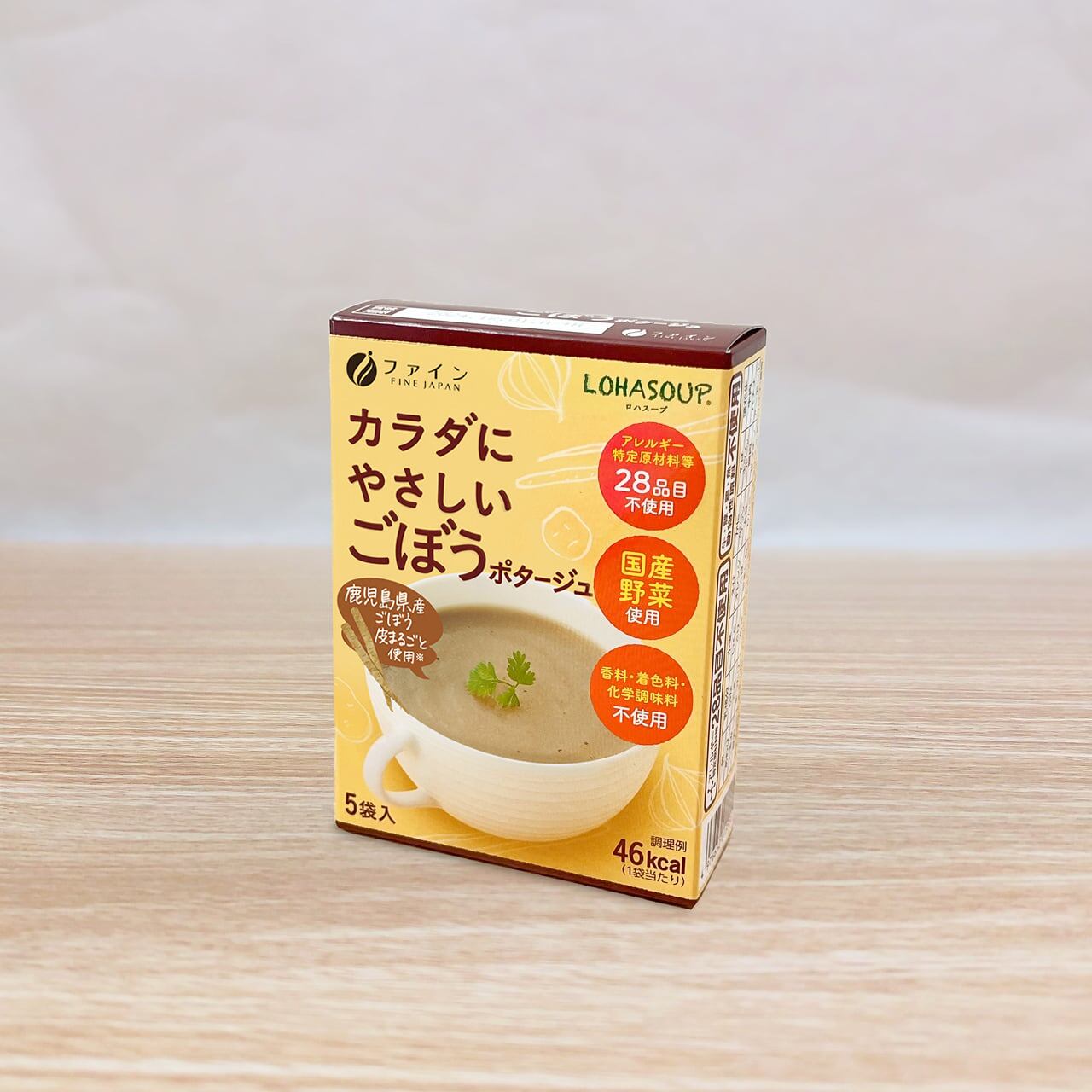 国産の野菜を使用し、ごぼう、じゃがいも、玉ねぎをブレンドしたほっこりやさしいお味のごぼうポタージュ。さらに、日本の海水100%の国産焼塩、国産のてん菜糖を使用し、自然のおいしさをギュッとまとめました。
